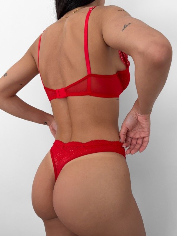 Set con con aro de taza alta de puntilla. Con base y espalda de microtull y less entera, colaless de puntilla.