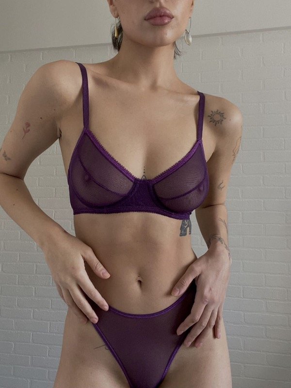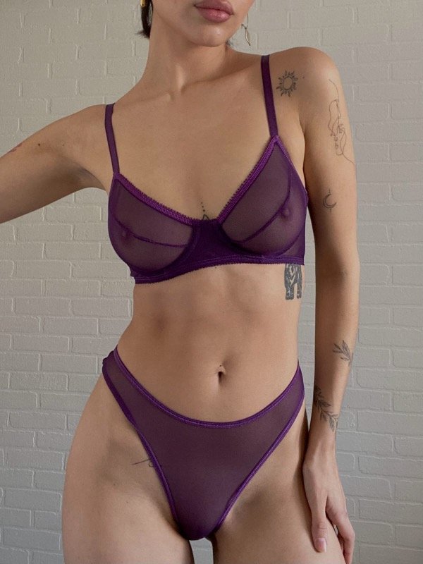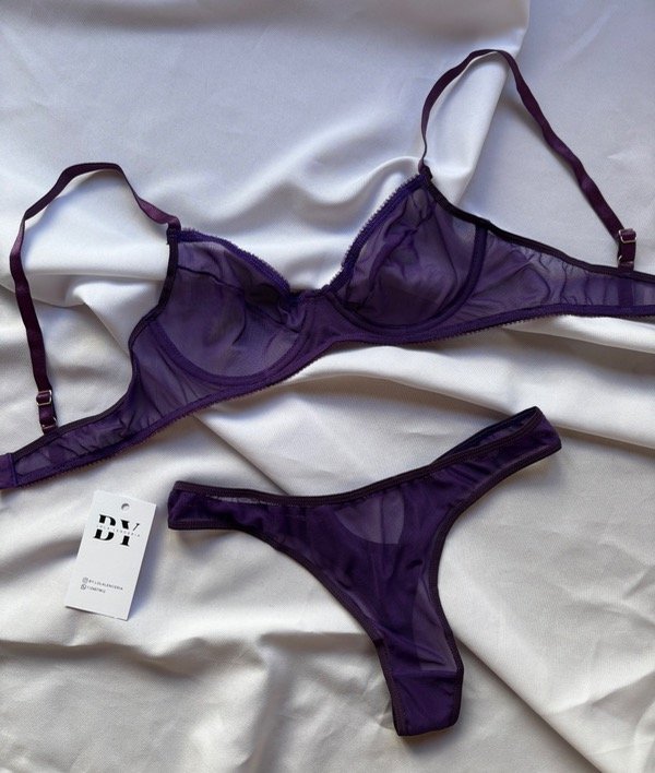 Conjunto delicado en microtul y con aro. Bombacha con detalle en la parte de atrás. Sus breteles del corpiño son regulables.