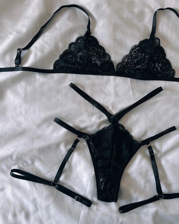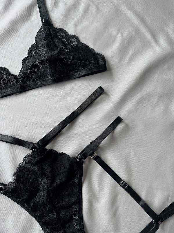 Set de encaje con portaligas desmontable. Breteles del corpiño regulable y less regulable.